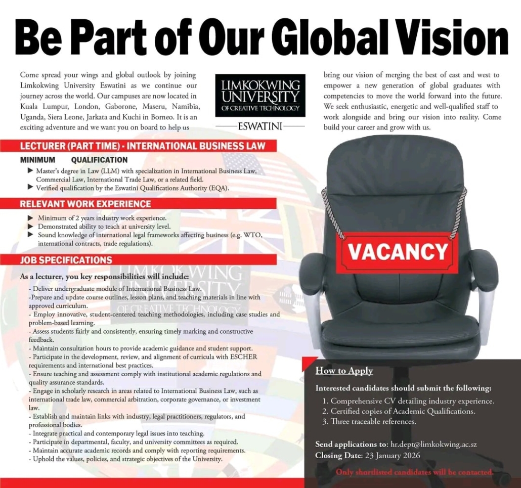 Send applications to: hr.dept@limkokwing.ac.sz