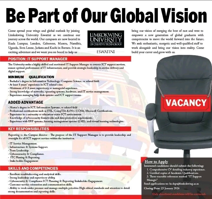 To apply for this job email your details to hr.dept2@limkokwing.ac.sz.