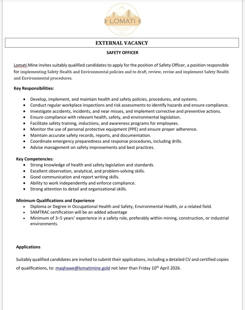 APPLICATIONS Suitably qualified candidates are invited to submit their applications, including a detailed CV and certified copies of qualifications, to: maqhawe@lomatimine.gold not later than Friday 10th April 2026.
