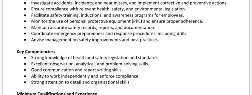 - Diploma or Degree in Occupational Health and Safety, Environmental Health, or a related field.