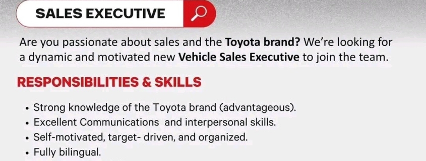 - Strong knowledge of the Toyota brand (advantageous).