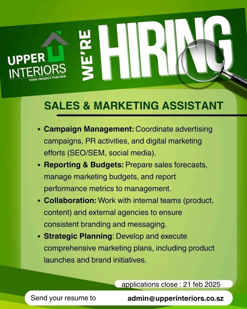 Send your resume to admin@upperinteriors.co.sz