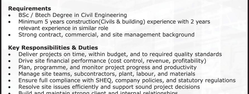 - Minimum 5 years construction (Civils & building) experience with 2 years relevant experience in similar role.