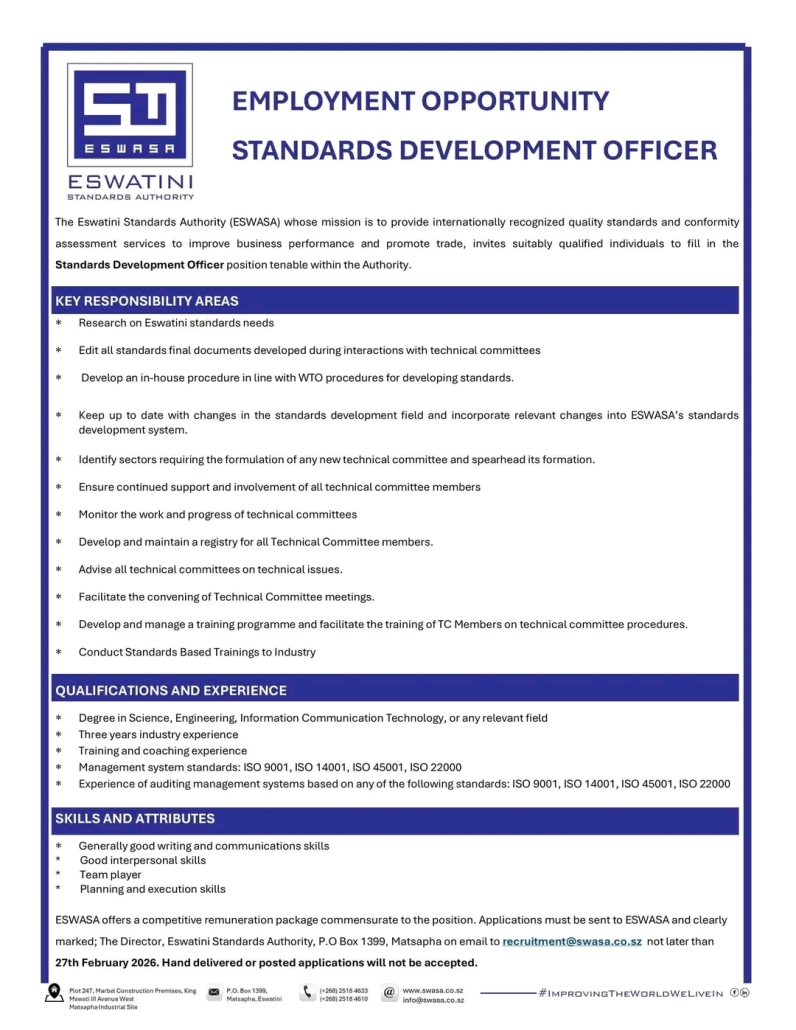 ESWASA offers a competitive remuneration package commensurate to the position. Applications must be sent to ESWASA and clearly marked; The Director, Eswatini Standards Authority, P O Box 1399, Matsapha on email to recruitment@swasa.co.sz not later than 27th February 2026.