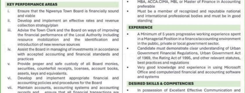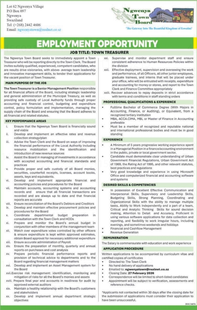 The Ngwenya Town Board seeks to immediately appoint a Town Treasurer who will be reporting directly to the Town Clerk. The Board invites suitably qualified, experienced, competent candidates, who are results-driven visionaries, with above-average team leadership and innovative management skills, to tender their applications for the vacant position of Town Treasurer.
