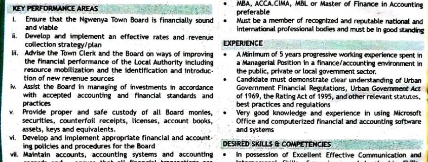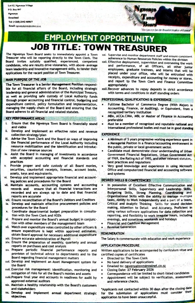 The Ngwena Town Board seeks to immediately appoint a Town Treasurer who will be reporting directly to the Town Clerk. The Board invites suitably qualified, experienced, competent candidates, who are results-driven, with above-average team leadership and innovative management skills, to tender their applications for the vacant position of Town Treasurer.