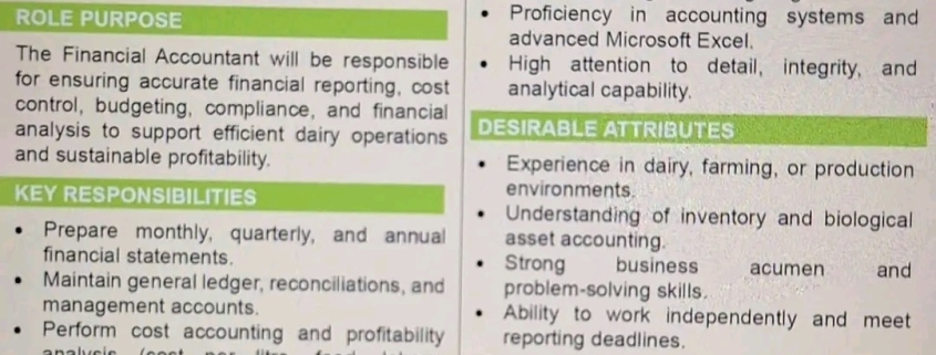 The Financial Accountant will be responsible for ensuring accurate financial reporting, cost control, budgeting, compliance, and financial analysis to support efficient dairy operations and sustainable profitability.