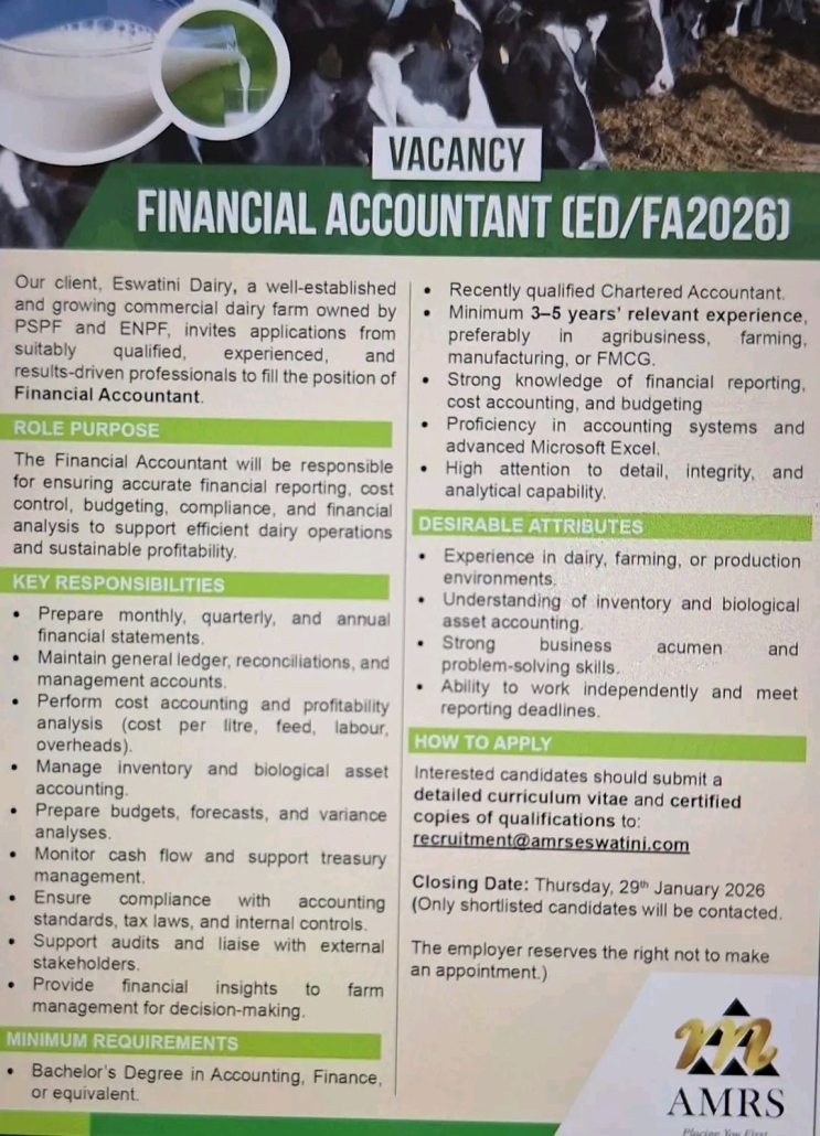 Our client, Eswatini Dairy, a well-established and growing commercial dairy farm owned by PSPF and ENPF, invites applications from suitably qualified, experienced, and results-driven professionals to fill the position of Financial Accountant.