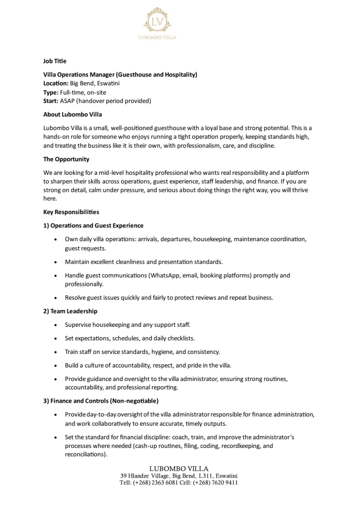 Lubombo Villa is a small, well-positioned guesthouse with a loyal base and strong potential. This is a hands-on role for someone who enjoys running a tight operation properly, keeping standards high, and treating the business like it is their own, with professionalism, care, and discipline.