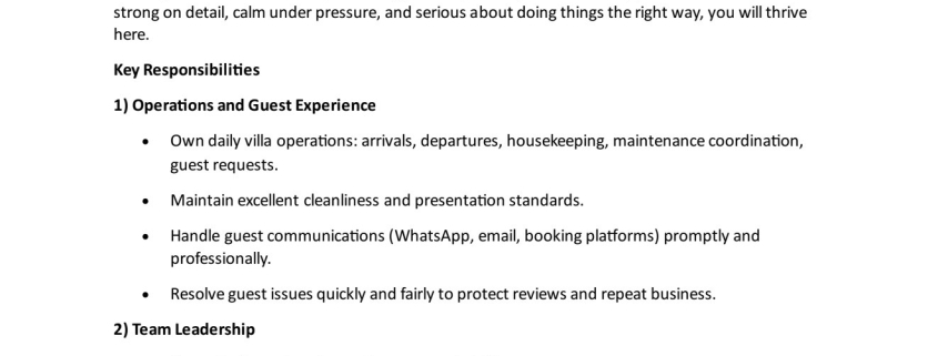 Own daily villa operations: arrivals, departures, housekeeping, maintenance coordination, guest requests.