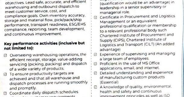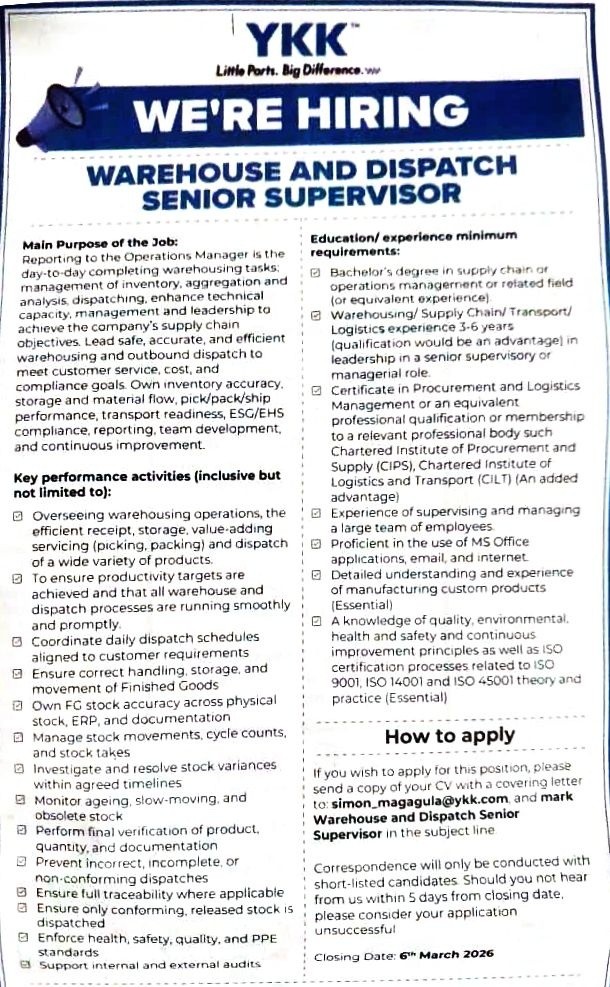 Warehousing/Supply Chain/Transport/Logistics experience 3–6 years (qualification would be an advantage) in leadership in a senior supervisory or managerial role.